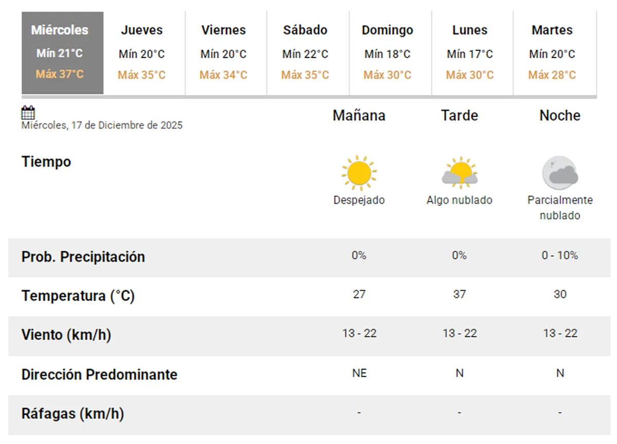 El Servicio Meteorológico Nacional (SMN) anticipa para este miércoles 17 de diciembre una jornada con condiciones estables en la provincia de San Juan, sin probabilidad significativa de precipitaciones y con temperaturas elevadas.