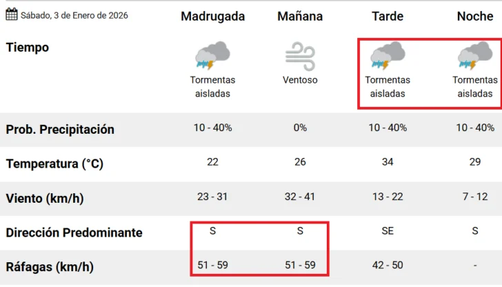 El SMN anticipa además la presencia de viento sur con ráfagas que podrían alcanzar los 59 kilómetros por hora. Estas condiciones estarán acompañadas por probabilidades de tormentas aisladas durante gran parte de la jornada.
