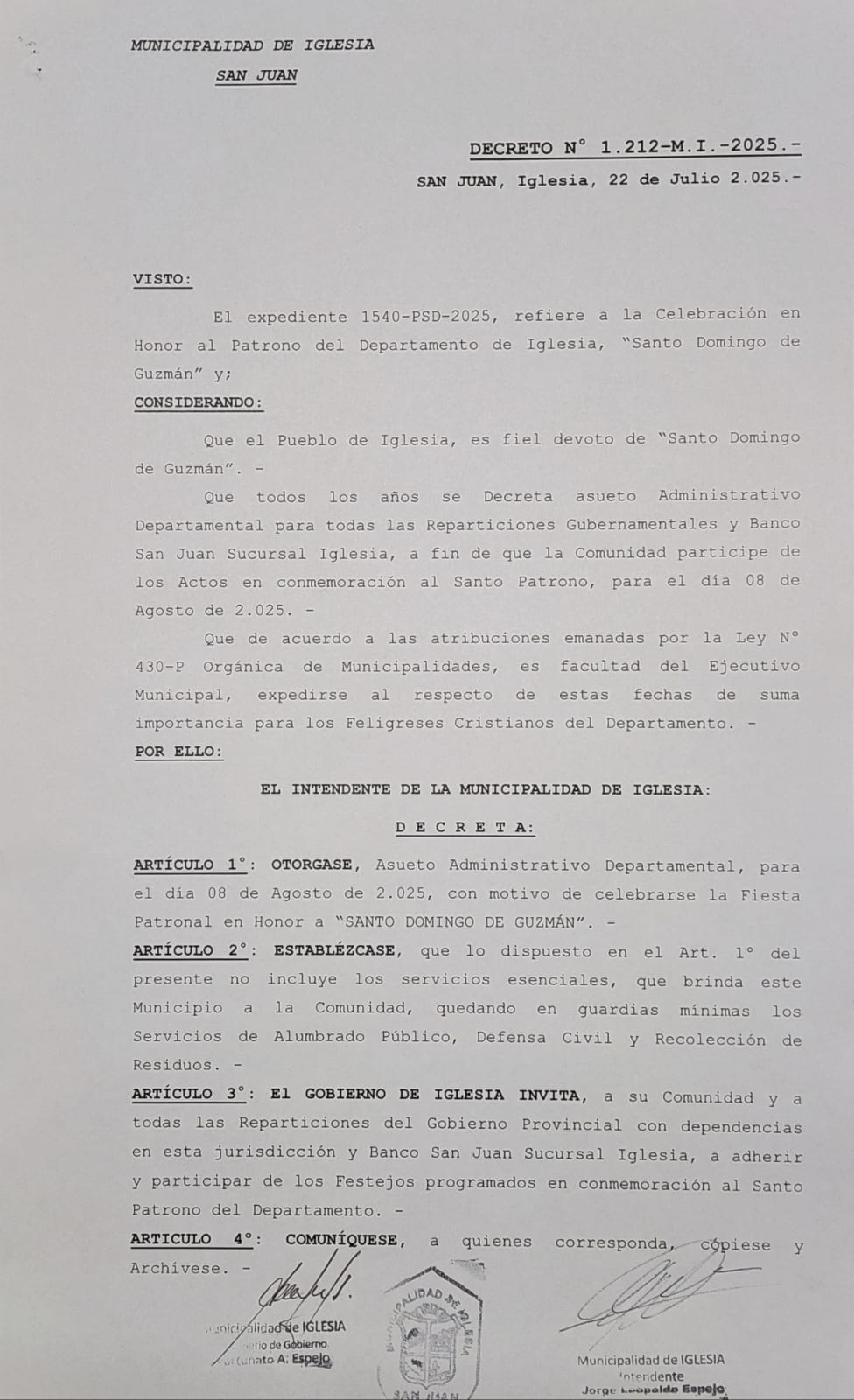La Municipalidad de Iglesia, a través de un decreto firmado por el intendente Jorge Espejo con fecha del 22 de julio del corriente año, ha establecido asueto administrativo para el próximo viernes 8 de agosto, con motivo de celebrarse la Fiesta Patronal en honor a Santo Domingo de Guzmán, patrono del departamento.