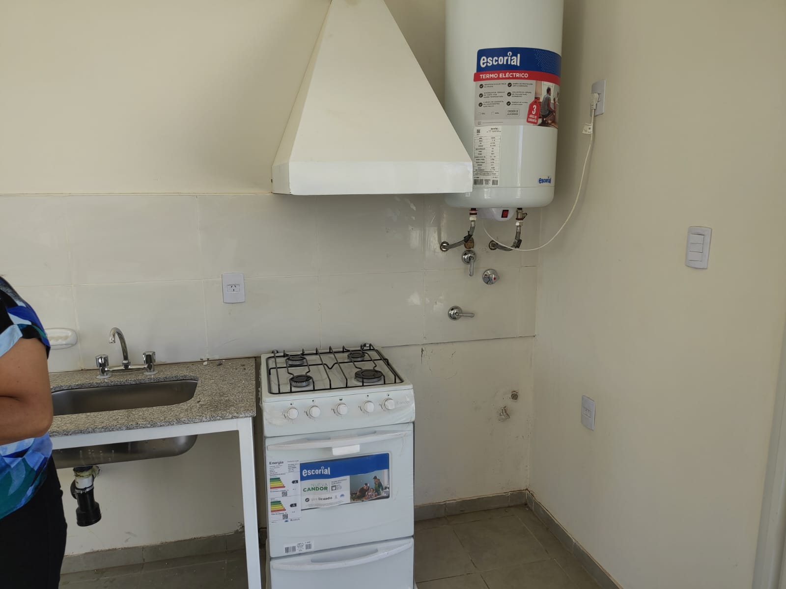 Cocina Mesada de granito natural, bacha de acero inoxidable, cocina de cuatro hornallas, termotanque eléctrico y campana.