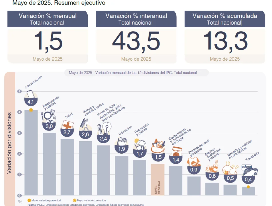 ✅ El IPC Nacional registró una variación de 1,5% en mayo, con una inflación núcleo de 2,2%, una variación en las categorías estacionales de -2,7% y en regulados de 1,3%.