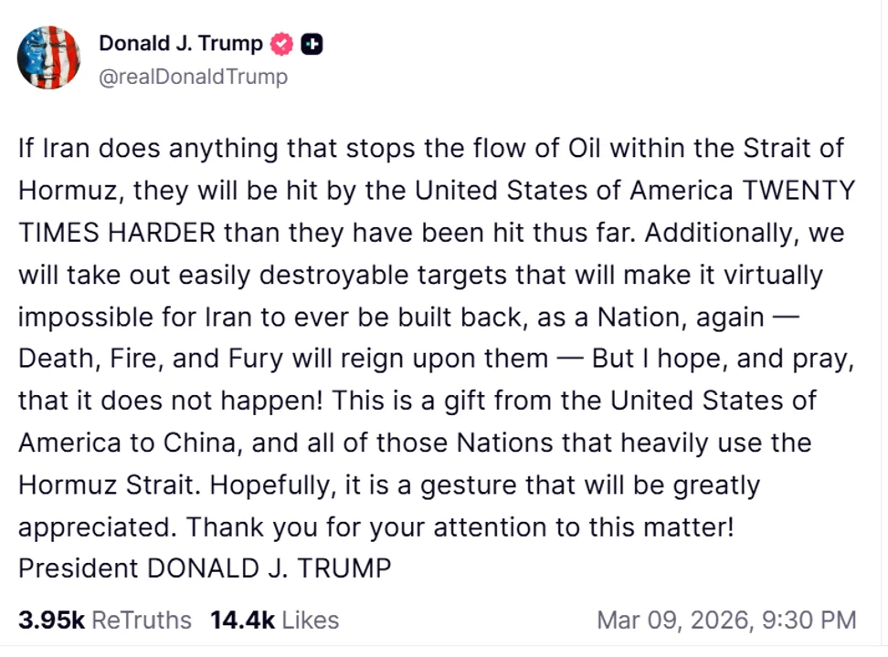 “Si Irán hace algo que detenga el flujo de petróleo en el Estrecho de Ormuz, será golpeado por Estados Unidos VEINTE VECES MÁS FUERTE de lo que ha sido hasta ahora”, escribió Trump en su red social Truth Social.