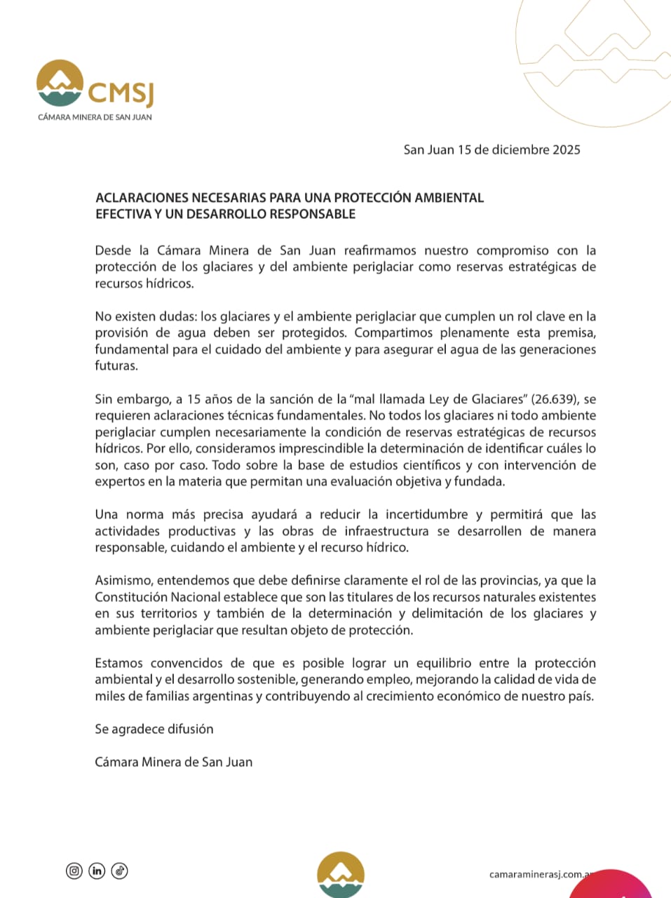 Finalmente, la Cámara Minera de San Juan expresó su convicción de que es posible alcanzar un equilibrio entre la protección ambiental y el desarrollo sostenible, promoviendo la generación de empleo, la mejora en la calidad de vida de miles de familias y el crecimiento económico del país.